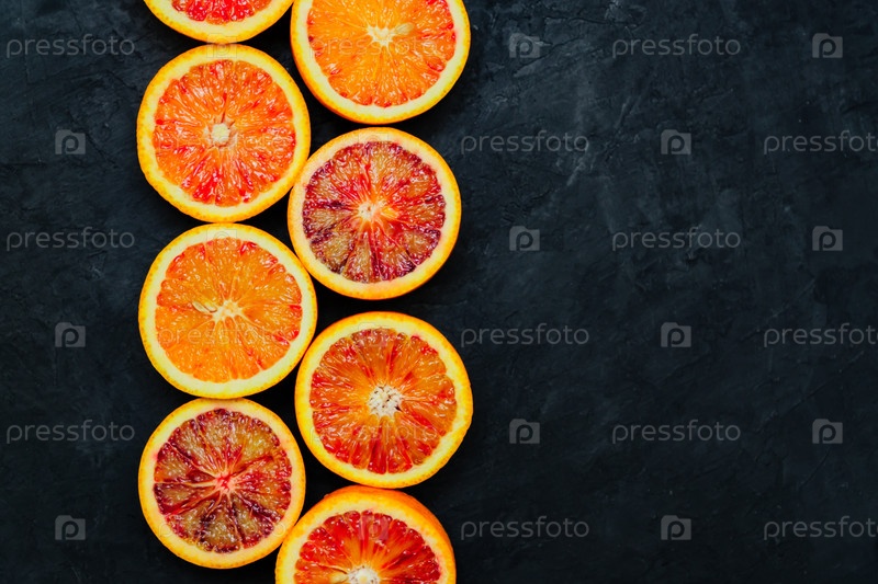 Нарезанные сицилийские кровавые апельсины на черном каменном естественном фоне, вид сверху