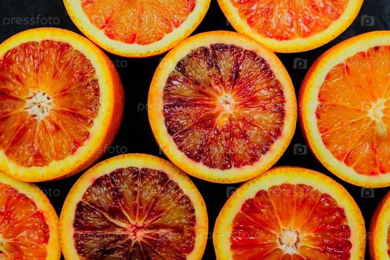 Сочный фон из ломтиков кровавого апельсина на черном фоне