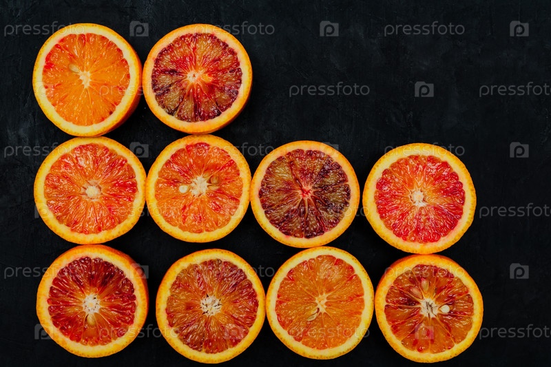 Красивый фон из ломтиков кровавого апельсина рядами на черном фоне