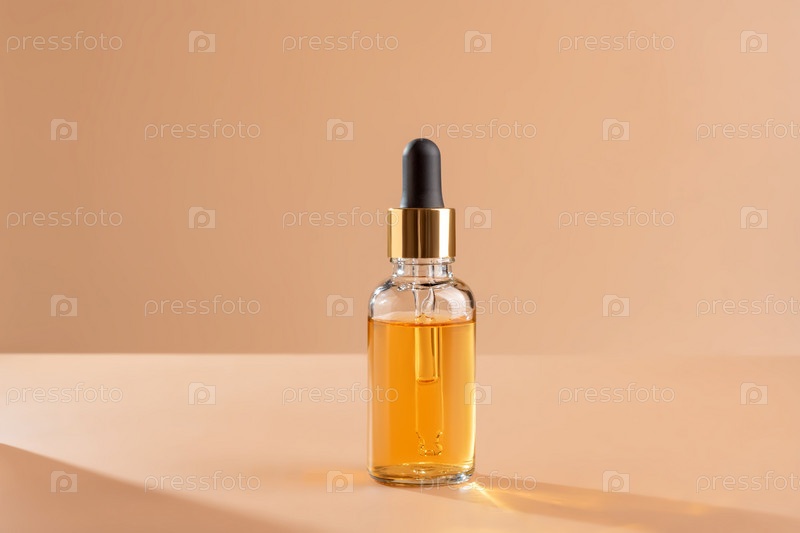 Стеклянная бутылка-капельница с сывороткой для ухода за красотой, гиалуроновой кислотой и витаминами на синем фоне с модными жесткими тенями. Домашняя косметика и спа-концепция