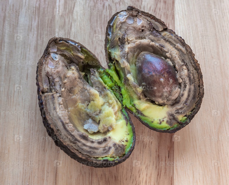 Гнилой авокадо разрезать пополам на деревянном фоне
