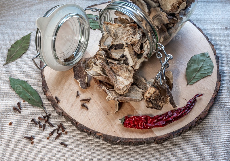Сушеные белые грибы, высыпающиеся из банки для хранения