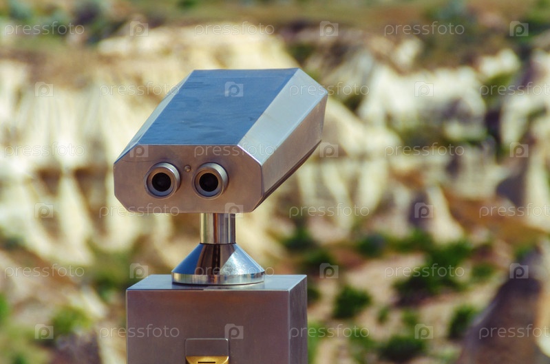Бинокль с панорамным видом на природные вулканические породы на заднем плане. Каппадокия в долине Деврент, Турция. - Изображение