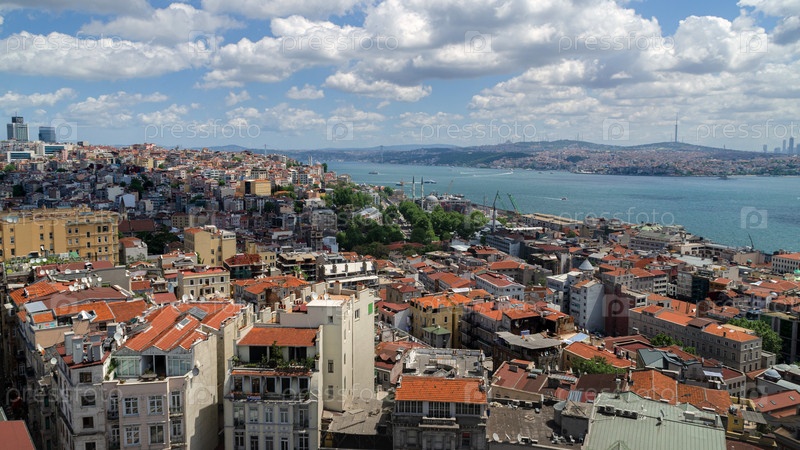Панорамный вид на Стамбул с Галатской башни. Мосты, мечети и Босфор. Стамбул, Турция