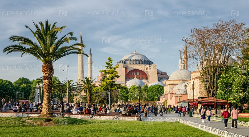 Стамбул, Турция - 02 мая 2018 г.: Редакция: Собор Святой Софии вечером на фоне голубого неба весной в Стамбуле, Турция