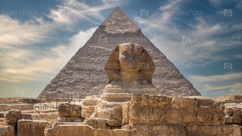 Большой сфинкс и пирамиды, известное чудо света, Гиза, Египет