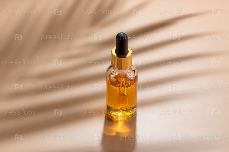 Мокет косметической косметики для макияжа сыворотки с концепцией ухода за кожей и здоровьем на фоне beigr в тени пальмового листа.Минималистский стиль