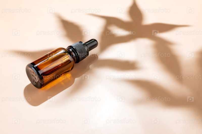 Янтарная бутылка масла каннабиса, используемая в медицинских целях на бежевом фоне с дневным светом и тенью листьев конопли. успокаивающее масло cbd. альтернативная медицина, макет с копией пространства