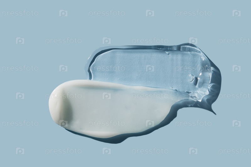 Белый крем и прозрачная гелевая текстура на синем фоне. Мазки средств по уходу за кожей