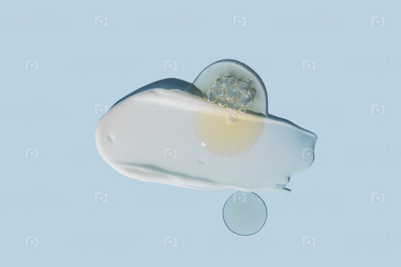 Мазок образца двойной текстуры сыворотки и крема на синем фоне, прозрачная желтая сыворотка, средство по уходу за кожей, плоский слой, крем с гиалуроновой кислотой