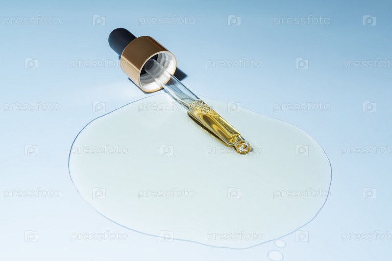 Закройте пипетку с заливкой жидкой сыворотки и тенями на синем фоне. Модная косметика с жесткими тенями