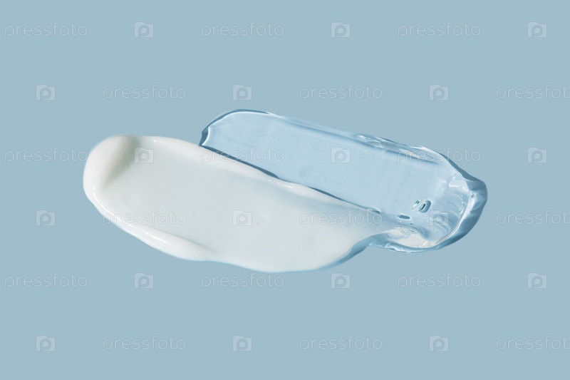 Кремовая текстура. косметический крем инсульт, гель для ухода за лицом. Белый кремовый муравьиный прозрачный гель-мазок на синем фоне. Пятно солнцезащитного крема для лица. Кремовая основа или увлажняющий крем