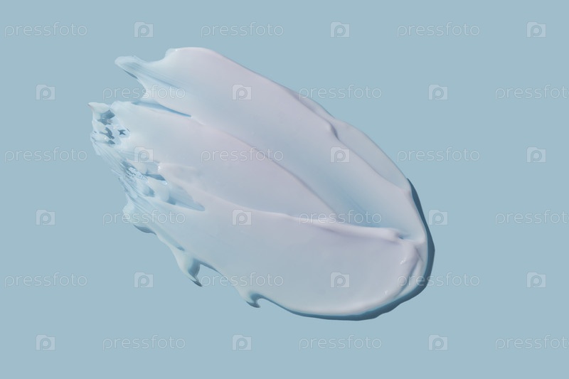 Текстура белого крема на синем фоне. Мазок косметического средства по уходу за кожей. Концепция здоровья и красоты. Вид сверху