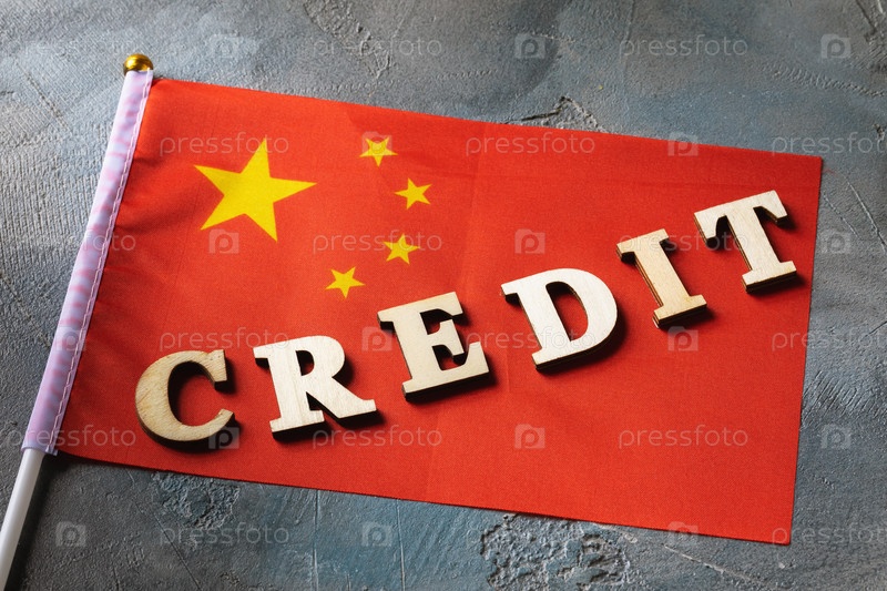 Текст из деревянных букв и китайский флаг на абстрактном фоне, кредитная концепция из Китая