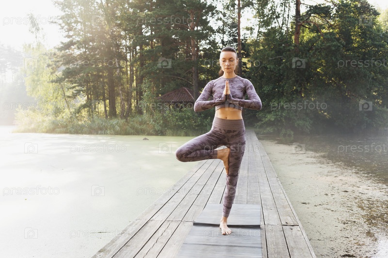 Женщина выполняет упражнение врикшасана, поза дерева, стоит на коврике на деревянном мосту летним утром в парке
