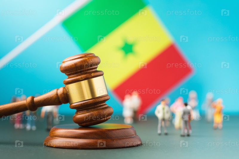 Судья молоток на фоне размытого флага и пластиковых игрушечных человечков, концепция судебного разбирательства в сенегальском обществе