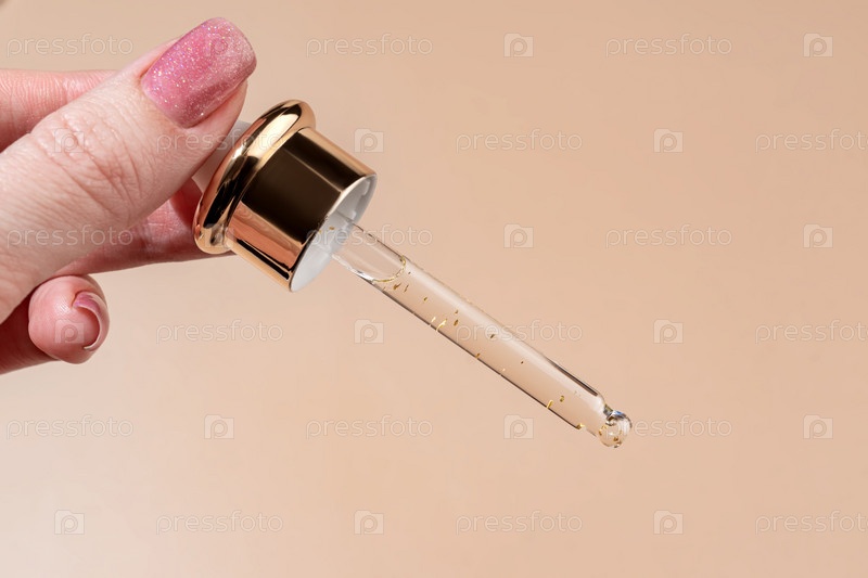 Косметический гель или коллагеновая сыворотка с хлопьями 24-каратного золота в пипетке с пузырьками на бежевом фоне