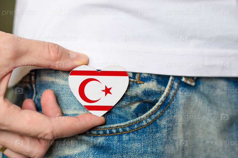 Житель Северного Кипра. Деревянный значок с флагом Турецкой Республики Северного Кипра в форме сердца в мужской руке