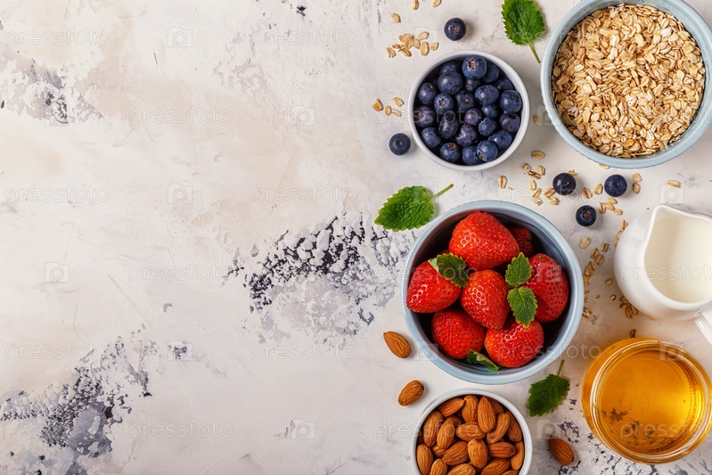 Здоровый завтрак - миска овсянки, ягод и фруктов, вид сверху