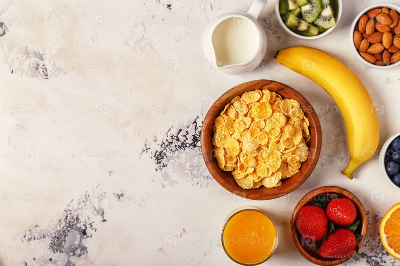 Здоровый завтрак - миска кукурузных хлопьев, ягод и фруктов
