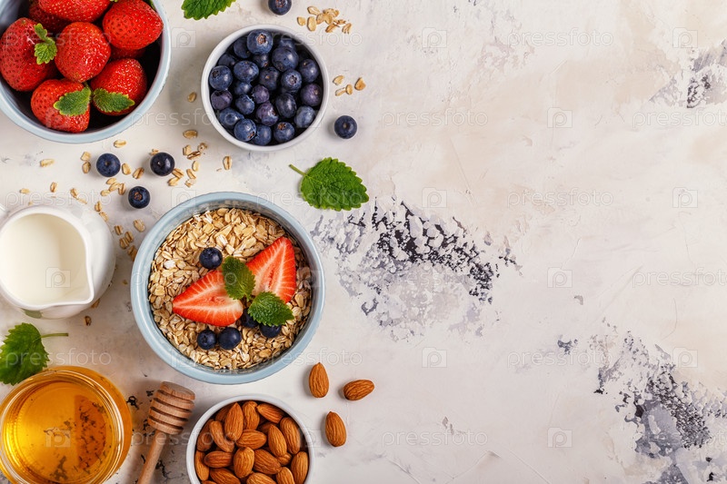 Здоровый завтрак - миска овсянки, ягод и фруктов, вид сверху