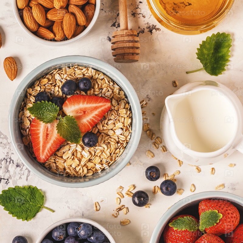 Здоровый завтрак - миска овсянки, ягод и фруктов, вид сверху
