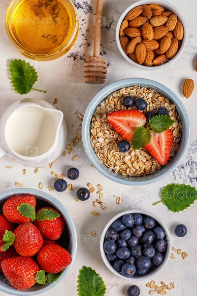 Здоровый завтрак - миска овсянки, ягод и фруктов, вид сверху