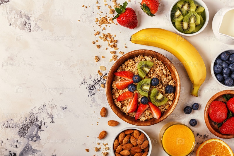 Здоровый завтрак - чаша мюсли, ягод и фруктов