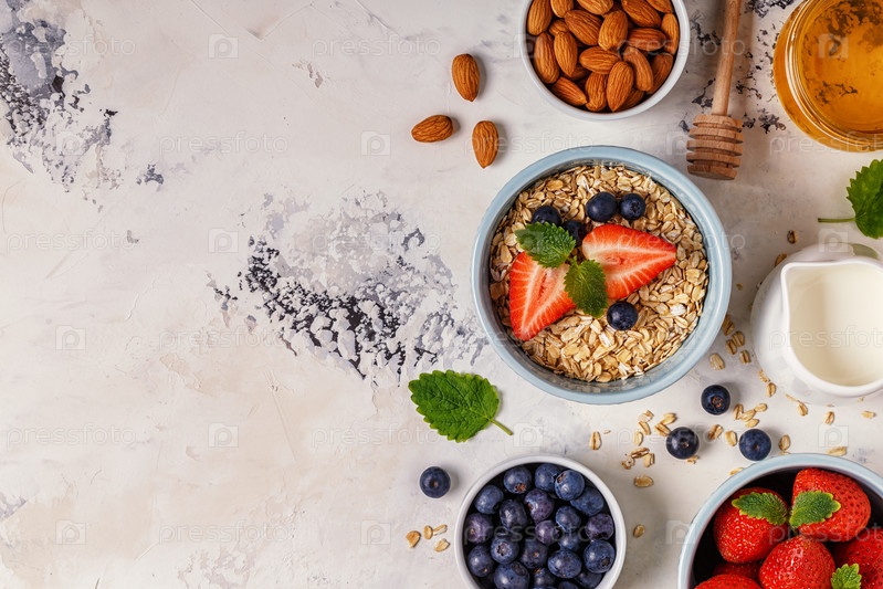 Здоровый завтрак - миска овсянки, ягод и фруктов, вид сверху