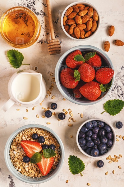 Здоровый завтрак - миска овсянки, ягод и фруктов, вид сверху