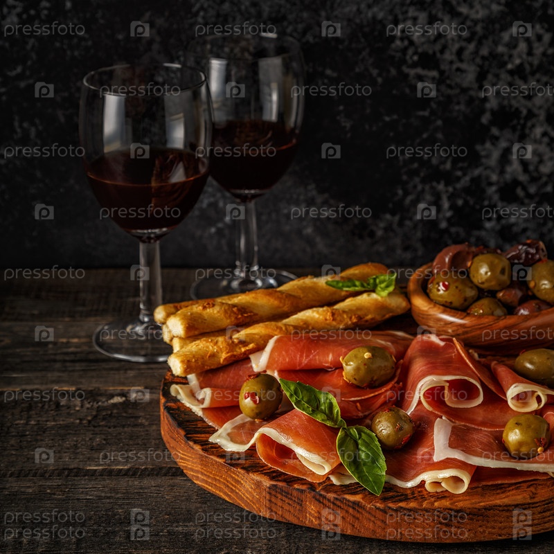 Прошутто, крекер, хлебные палочки с красным вином