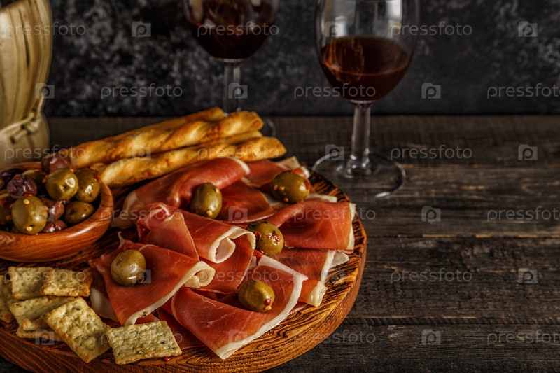 Прошутто, крекер, хлебные палочки с красным вином