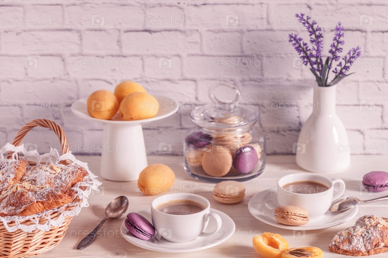Завтрак с различными миндальными печеньями, круассанами и горячим шоколадом