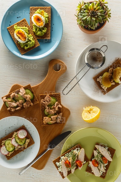 Здоровые бутерброды с различными начинками на хрустящем ржаном хлебе