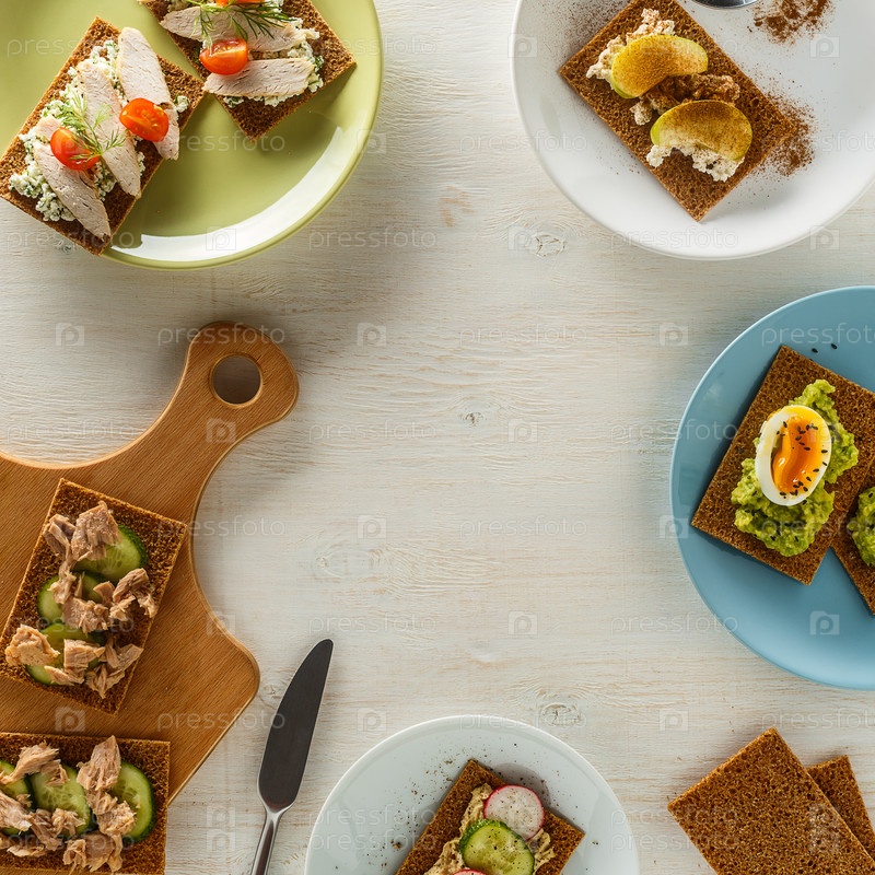 Здоровые бутерброды с различными начинками на хрустящем ржаном хлебе