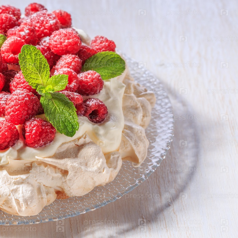 Безе Павлова со взбитыми сливками и свежей малиной