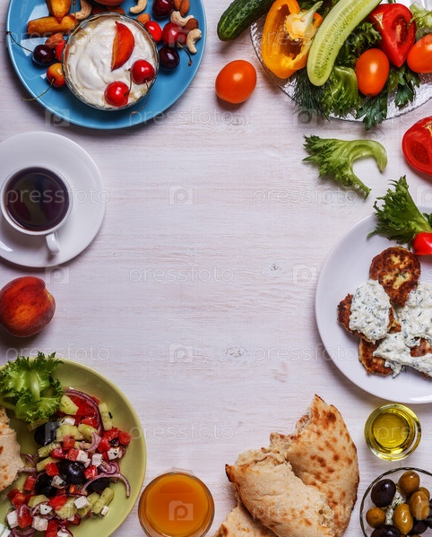 Греческие закуски - оладьи из кабачков, греческий салат, йогурт