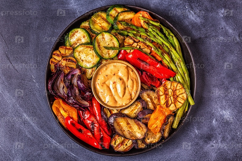 Жареные овощи на тарелке с соусом