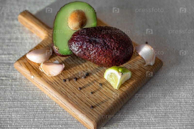 Крупный план некоторых сырых фруктов и овощей для приготовления гуакамоле, таких как авокадо, чеснок и лайм на деревянной разделочной доске