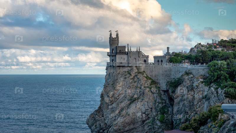 Замок Ласточкино гнездо на скале над Черным морем крупным планом, Крым, Ялта. Одна из самых популярных туристических достопримечательностей Крыма