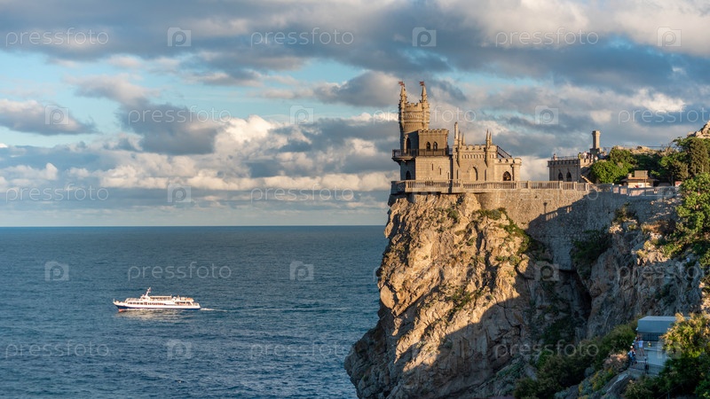 Замок Ласточкино гнездо на скале над Черным морем крупным планом, Крым, Ялта. Одна из самых популярных туристических достопримечательностей Крыма