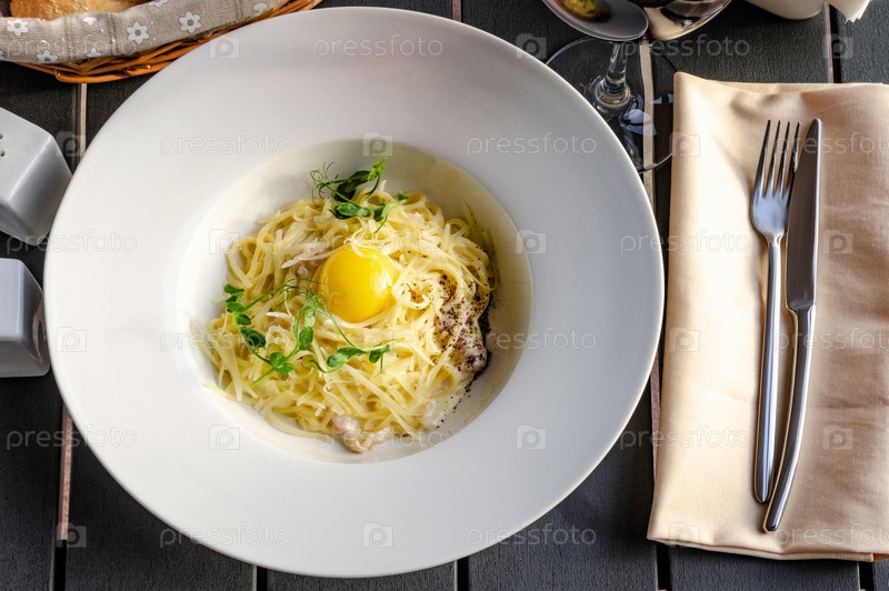 Паста карбонара в тарелке и бокал красного вина