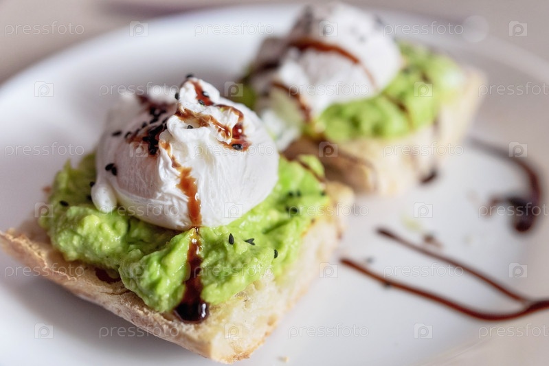Яйцо-пашот на ломтике тостового хлеба, с гуакамоле и капающим желтком, на белой тарелке