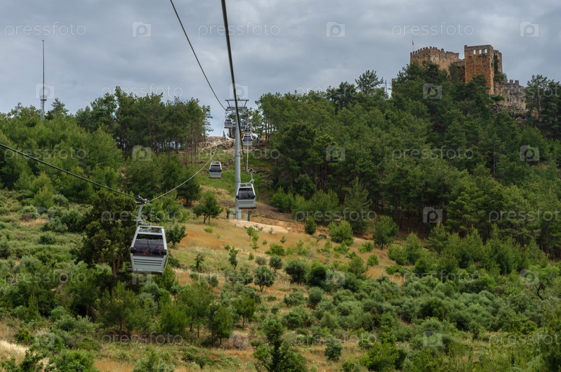 Аланья, Турция - 11 мая 2018 г.: Канатная дорога, доставляющая туристов из города в замок Аланьи