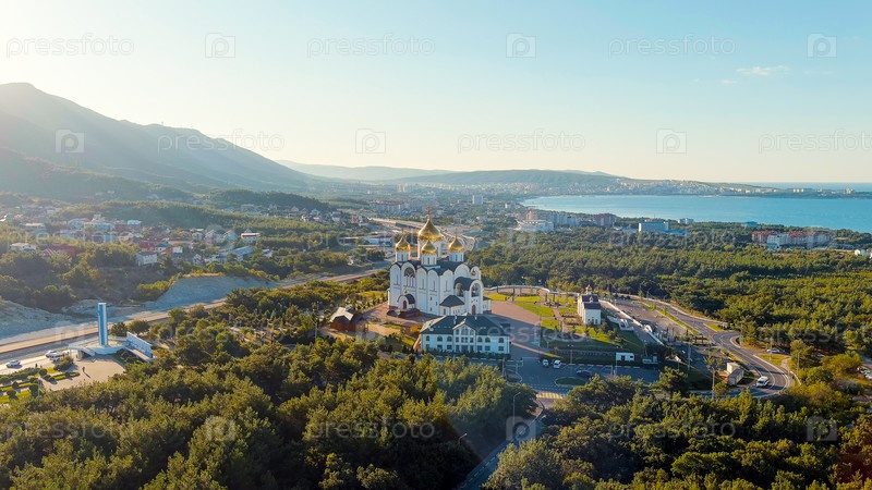 Геленджик, Россия. Собор Андрея Первозванного. Текст при въезде в город переводится как Геленжик-городской курорт, вид с воздуха