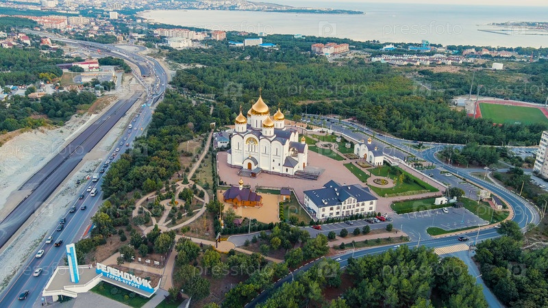 Геленджик, Россия. Собор Андрея Первозванного. Текст при въезде в город переводится как «Геленжик-городской курорт». Время заката, Вид с воздуха