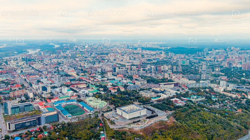 Уфа, Россия. Панорама центральной части города Уфы. Время после захода солнца, вид с воздуха