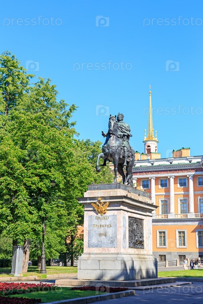 Памятник Петру I на площади Петра Великого.Текст переведен на английский язык: Прадед от правнука 1800 г