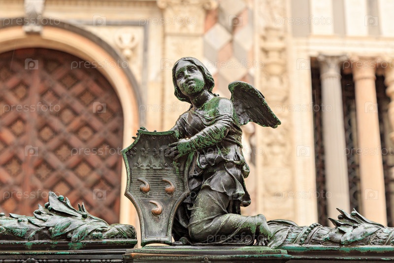 Бергамо, Италия. Миниатюрные античные статуэтки ангелов на ограде Капеллы Коллеони в Бергамо. Историческая часть города. Дождливая погода