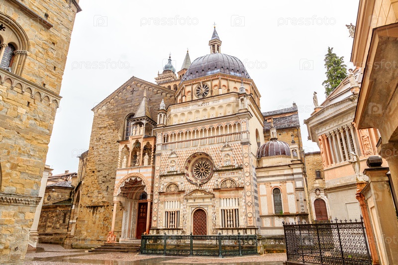 Бергамо, Италия. Капелла Коллеони в Бергамо. Историческая часть города. Дождливая погода